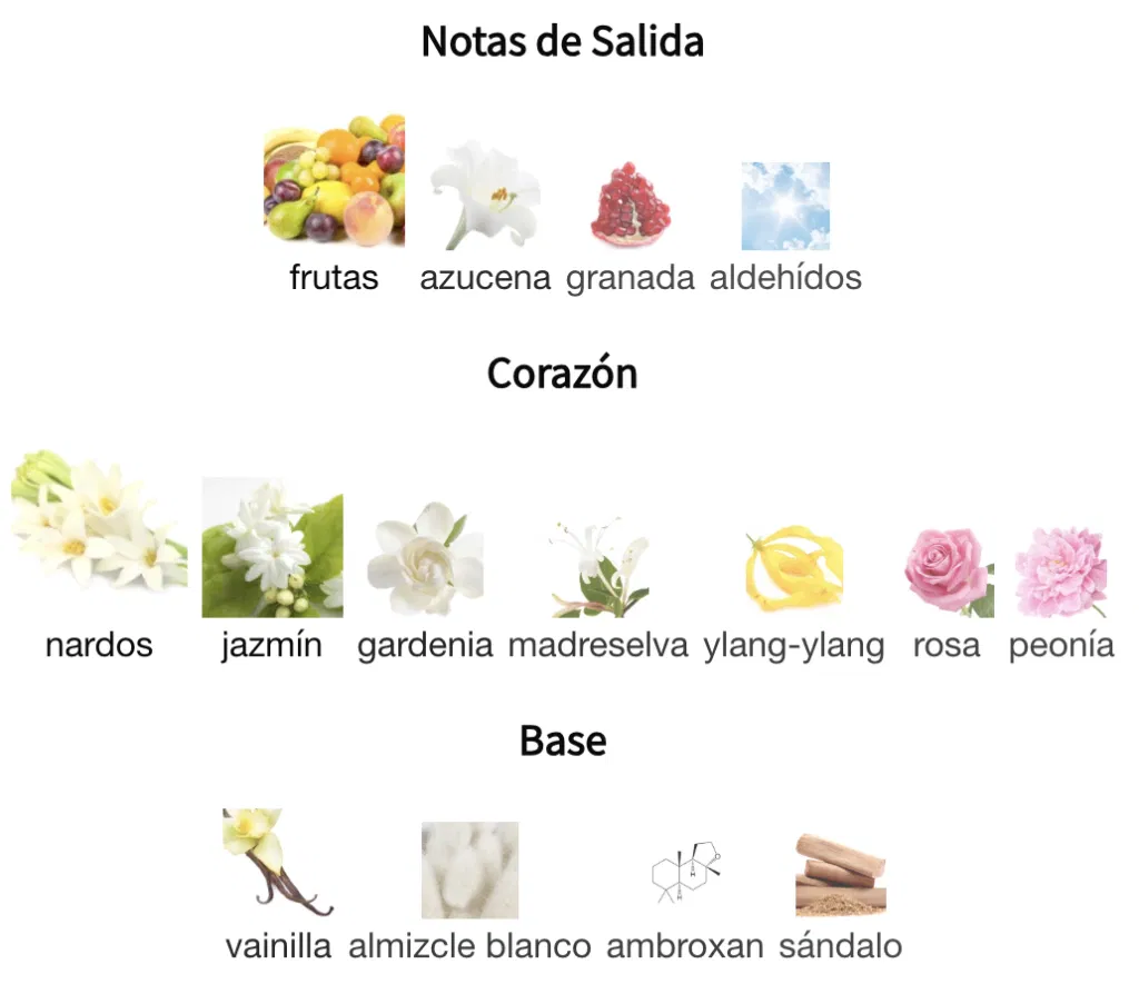 La fragancia se abre con notas de naranja y flor de azahar, aportando un inicio fresco y dulce. A medida que se desarrolla, se adentra en un bouquet floral compuesto por jazmín y tuberosa, creando un aroma seductor y femenino. Las notas de base son vetiver y pachulí, que añaden profundidad y una sensación de misterio y sensualidad al perfume.