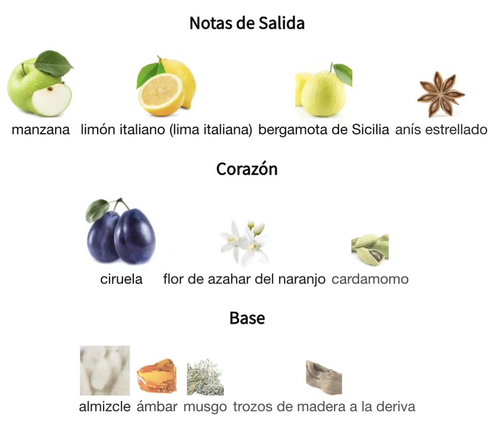 En el corazón, la dulzura de la ciruela se fusiona con la elegancia de la flor de azahar del naranjo y el carácter especiado del cardamomo, aportando un contraste sofisticado. La base es profunda y envolvente, con almizcle y ámbar que brindan calidez, mientras que el musgo y las maderas a la deriva aportan un matiz terroso y refinado.