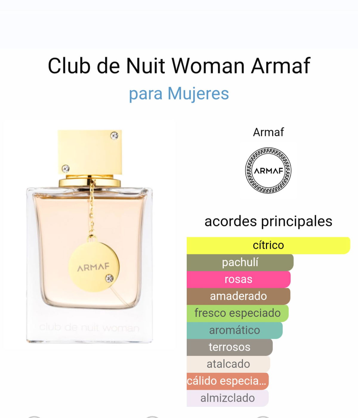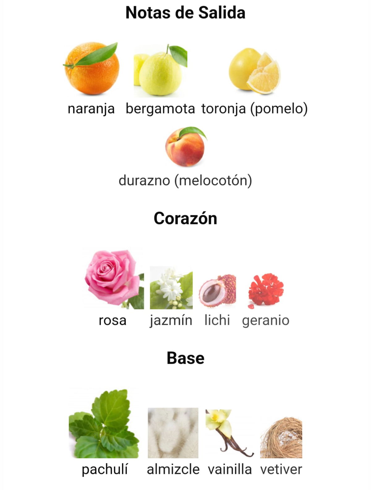 Las Notas de Salida son naranja, bergamota, toronja (pomelo) y durazno (melocotón); las Notas de Corazón son rosa, jazmín, lichi y geranio; las Notas de Fondo son pachulí, almizcle, vainilla y vetiver.