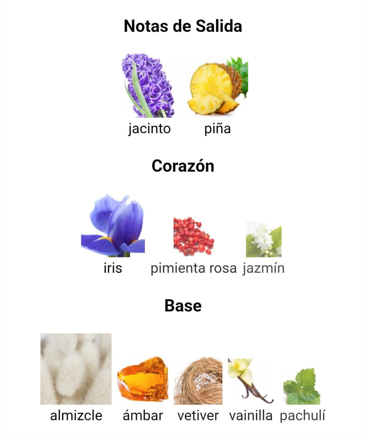 Las Notas de Salida son jacinto y piña; las Notas de Corazón son iris, pimienta rosa y jazmín; las Notas de Fondo son almizcle, ámbar, vetiver, vainilla y pachulí.