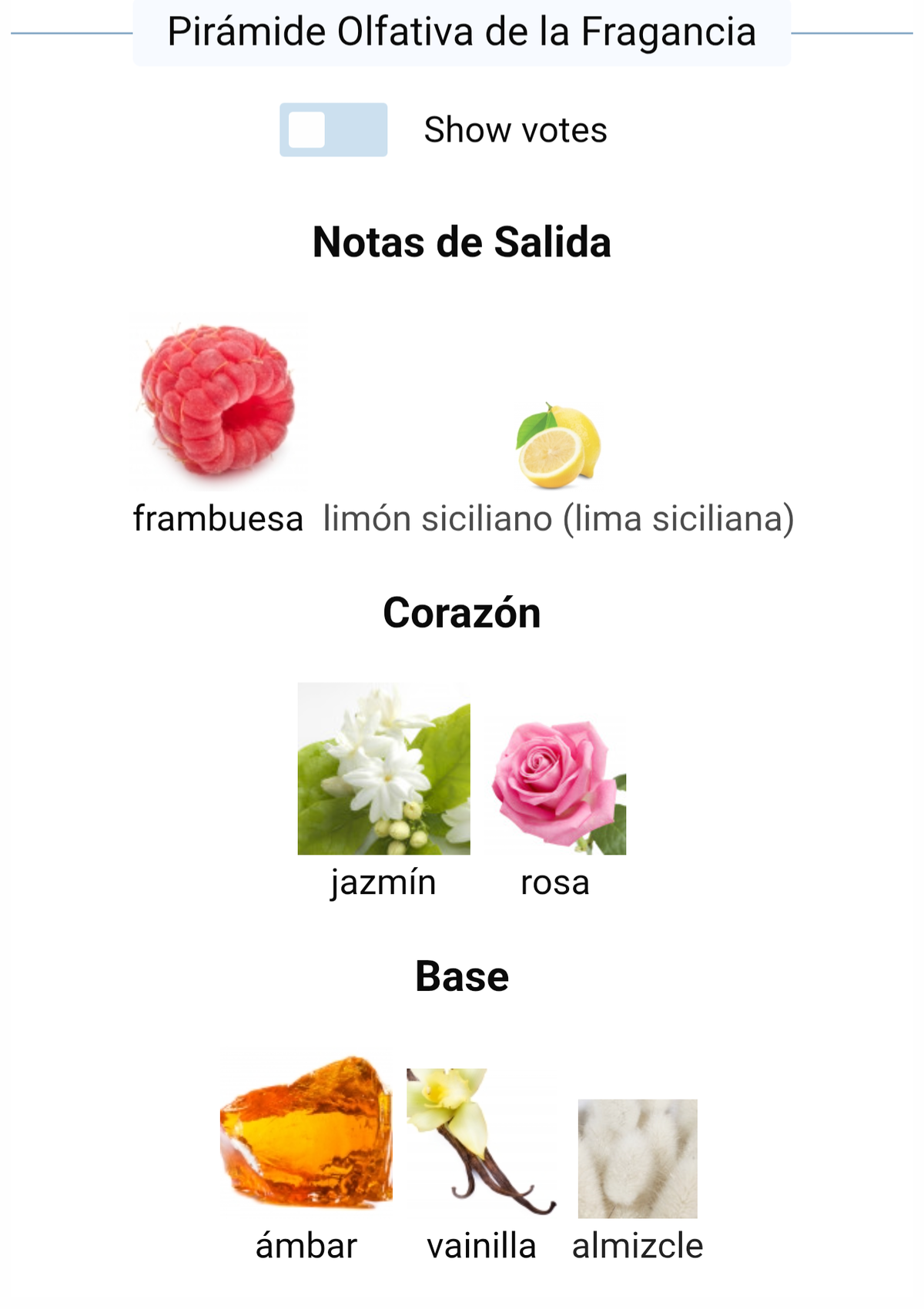 Las Notas de Salida son frambuesa y limón siciliano (lima siciliana); las Notas de Corazón son jazmín y rosa; las Notas de Fondo son ámbar, vainilla y almizcle.