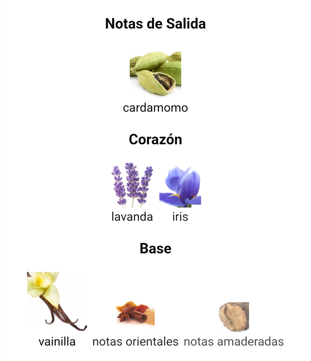 La Nota de Salida es cardamomo; las Notas de Corazón son lavanda y iris; las Notas de Fondo son vainilla, notas orientales y notas amaderadas.