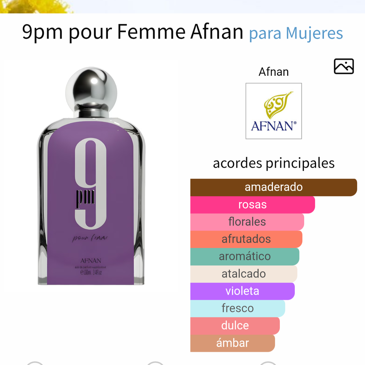 9pm pour Femme de Afnan es una fragancia de la familia olfativa Oriental Floral para Mujeres. Esta fragrancia es nueva. 9pm pour Femme se lanzó en 2022. Las Notas de Salida son frambuesa, violeta, manzana y naranja; las Notas de Corazón son rosa, iris, peonía y jazmín; las Notas de Fondo son pino, ciprés, ámbar y cedro.