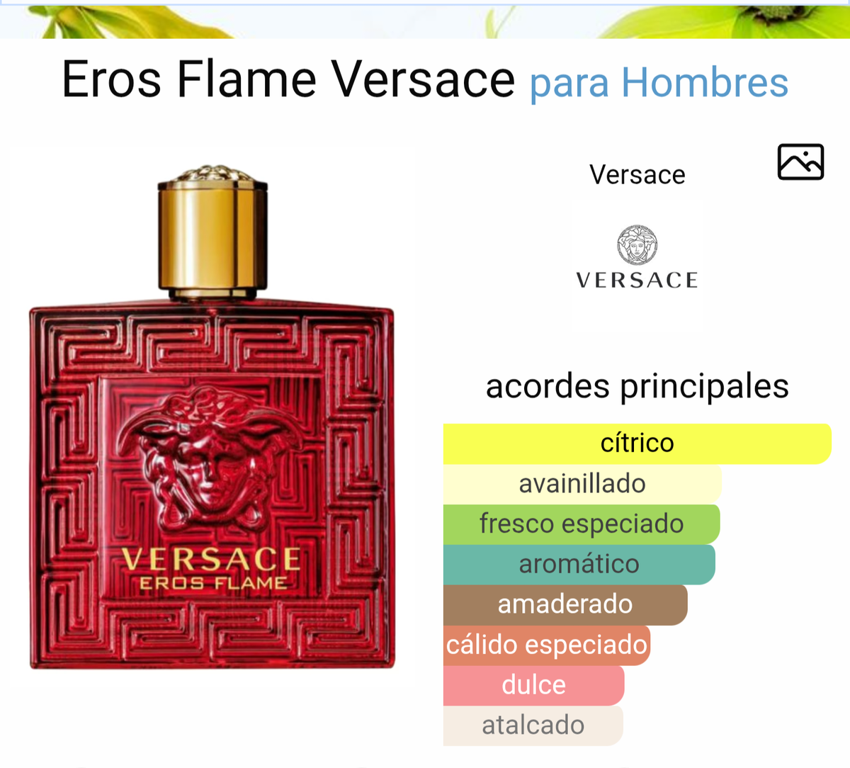 Eros Flame de Versace es una fragancia de la familia olfativa Amaderada Especiada para Hombres. Esta fragancia es nueva. Eros Flame se lanzó en 2018. La Nariz detrás de esta fragancia es Olivier Pescheux. Las Notas de Salida son Chinotto, limón (lima ácida), mandarina, pimienta negra y romero; las Notas de Corazón son rosa, geranio y pimienta; las Notas de Fondo son cedro de Texas, pachulí, haba tonka, vainilla, sándalo y musgo de roble.