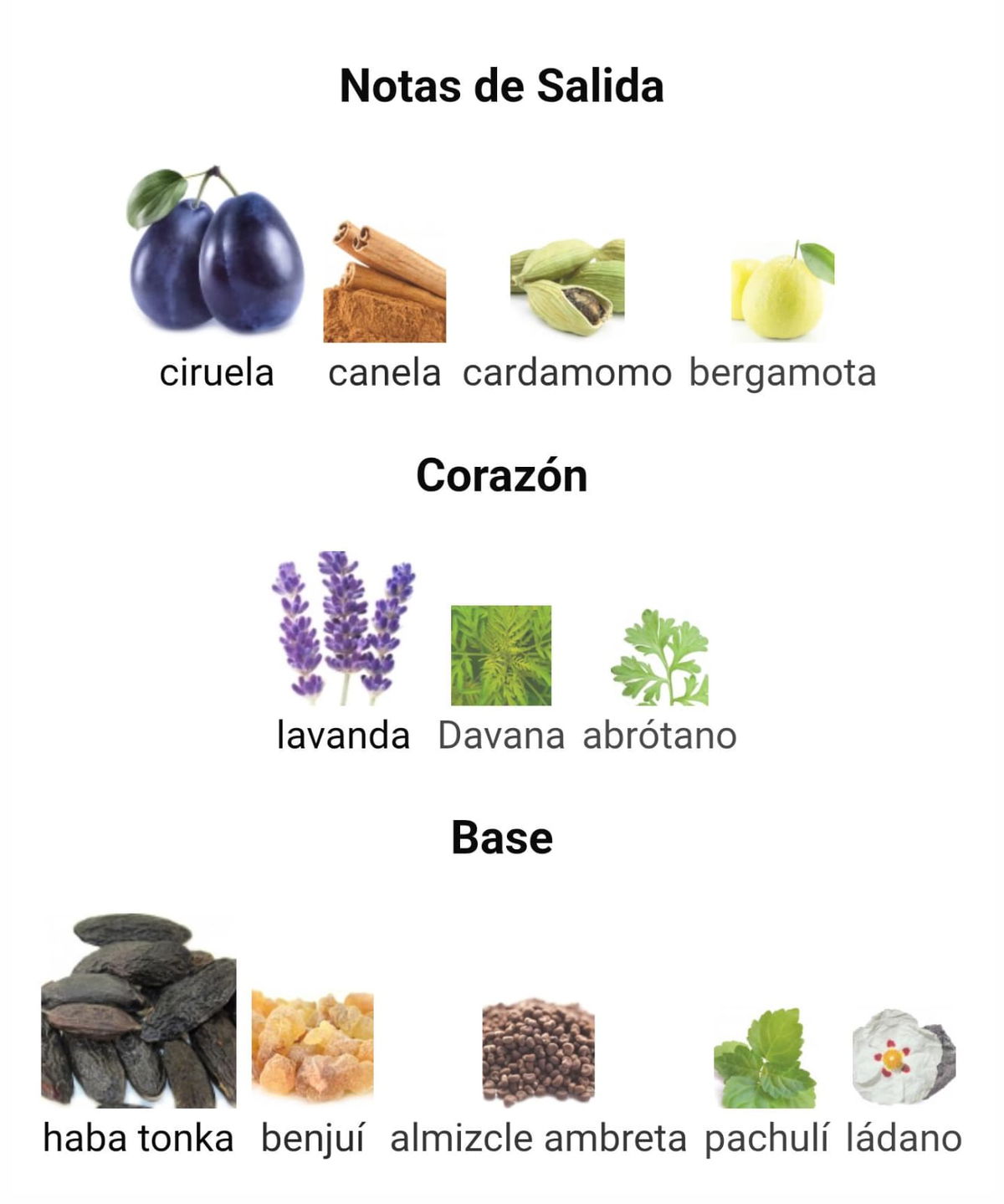 Las Notas de Salida son ciruela, canela, cardamomo y bergamota; las Notas de Corazón son lavanda, Davana y abrótano; las Notas de Fondo son haba tonka, benjuí, almizcle ambreta, pachulí y ládano.