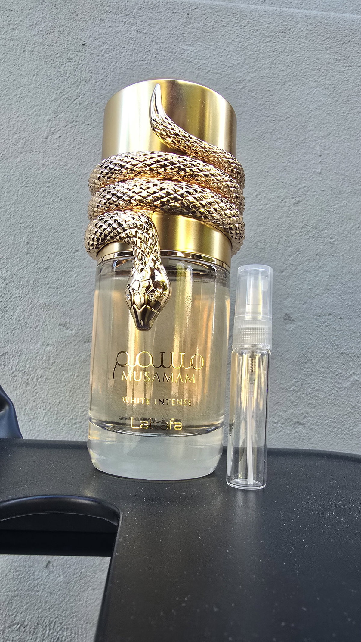 Musamam White Intense de Lattafa Perfumes es una fragancia de la familia olfativa Oriental Floral para Hombres y Mujeres. Musamam White Intense se lanzó en 2023. La Nariz detrás de esta fragrancia es Gaël Montero. Las Notas de Salida son especias, bergamota y naranja; las Notas de Corazón son coco, ylang-ylang, ambroxan y Mahonial; las Notas de Fondo son sándalo, almizcle y benjuí.
