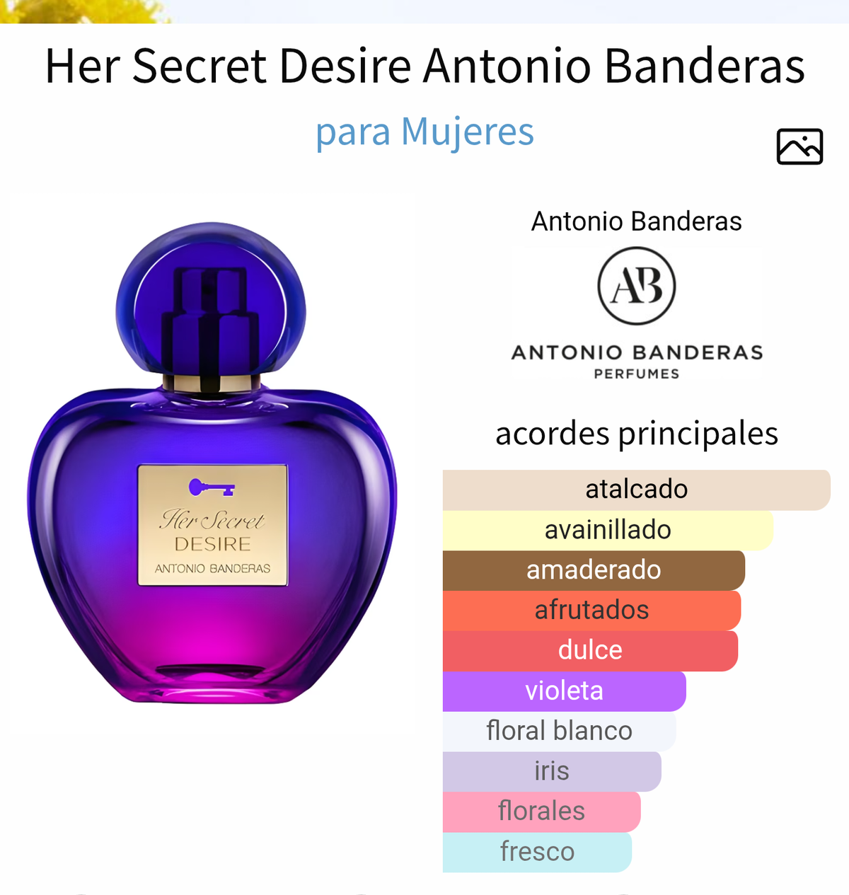 Her Secret Desire de Antonio Banderas es una fragancia de la familia olfativa Floral Frutal Gourmand para Mujeres. Her Secret Desire se lanzó en 2019. Las Notas de Salida son frambuesa y bergamota; las Notas de Corazón son violeta, raíz de lirio, jazmín de la India y neroli; las Notas de Fondo son vainilla, sándalo y abeto balsámico.